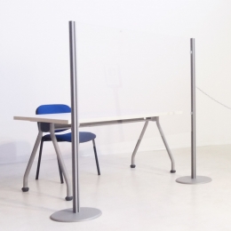 Pannello distanziatore e di protezione realizzato con piantane in alluminio, basi metalliche e lastra in vetro plastico trasparente spessore 5 mm. Dimensione lastra cm 150x100h, dimensione piantana cm 100h, dimensione base metallica diam cm 39. Ingombro pannello cm 194x39x100h. Sulle piantane del pannello possono essere montati gli accessori della linea DISTO. Possono essere realizzate composizioni con più pannelli in linea o a 90°.
