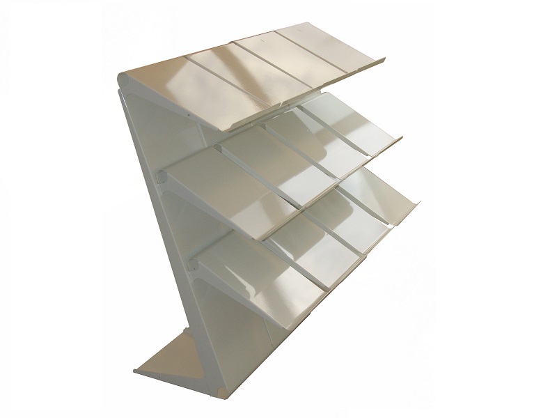 Espositore metallico per ESTERNO aggregabile a gondola della linea Theta, realizzato con lamiera metallica zincata mm 20\10 e ripiano inclinato cm32x38. Finitura con polveri epossipoliestere a caldo, colori: grigio alluminio, grigio micaceo, corten, blu sable, bianco. Ingombro espositore cm 32x38x102h