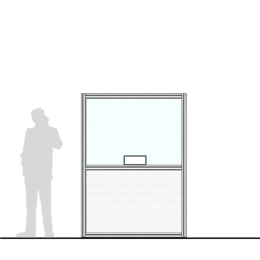• Pannello interno, porzione superiore: lastra in vetroplastico mm.5 trasparente con finestratura passacarte cm.30x8h;