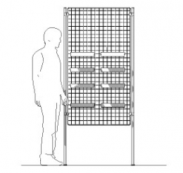 ESPOSITORE autostabile della linea STRATOS composto da n. 2 piantane metalliche con piede dritto cm 5x50h, n. 1 griglia metallica bifacciale, cm 100x200, n.6 morsetti giunto parallelo piatto cm 5,5, n.8 pianetti ad altezza regolabile in lamiera pressoliegata cm 12x30. Ingombro cm 50x108x205h. Finitura parti metalliche con polveri epossipoliestere a caldo, colori: grigio alluminio, grigio micaceo, bianco.