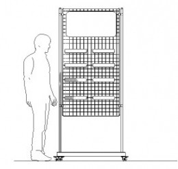 ESPOSITORE autostabile della linea STRATOS composto da n. 2 piantane metalliche con piede dritto cm 5x50h, n. 1 griglia metallica bifacciale, cm 100x200, n.6 morsetti giunto parallelo piatto cm 5,5, n.8 pianetti ad altezza regolabile in lamiera pressoliegata cm 12x30, pannello di base cm 95x60x5 , banner in dibond cm 60x30h. Ingombro cm 50x108x205h. Finitura parti metalliche con polveri epossipoliestere a caldo, colori: grigio alluminio, grigio micaceo, bianco.