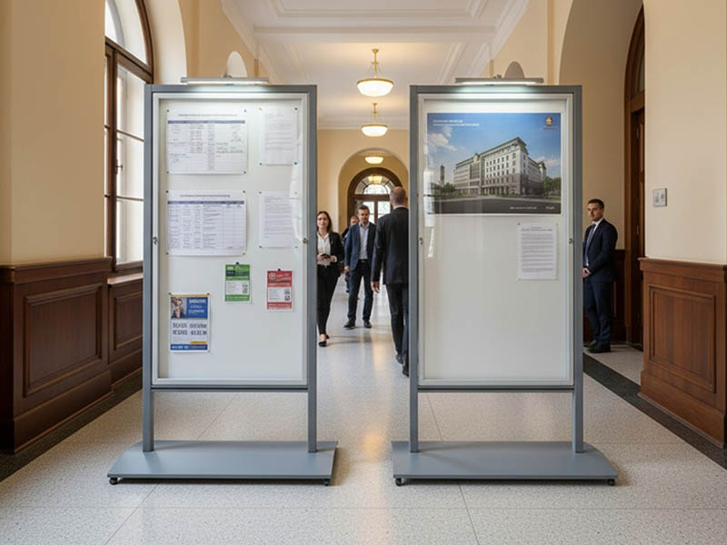 Bacheche autoportanti su ruote, bacheche a parete per scuole, enti, teatri, tribunali, centri commerciali. Bacheche modulari e di grandi dimensioni amovibili con lastre di protezione in policarbonato.