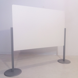 Pannello distanziatore e di protezione realizzato con piantane in alluminio, basi metalliche e lastra in forex spessore 10 mm. Dimensione lastra cm 150x100h, dimensione piantana cm 100h, dimensione base metallica diam cm 39. Ingombro pannello cm 194x39x130/140h. Sulle piantane del pannello possono essere montati gli accessori della linea DISTO. Possono essere realizzate composizioni con più pannelli in linea o a 90°.