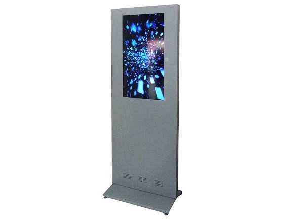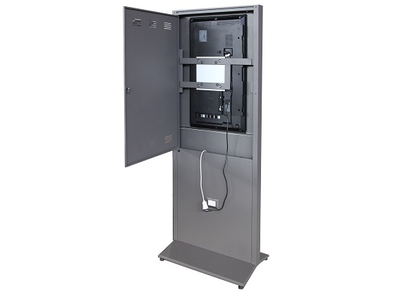 Totem autoportante monfacciale della linea Ostendo per dispositivi multimediali, touch screen, monitor, apparati informativi e divulgativi, con basamento metallico e pannello in lamiera pressopiegata. Finitura parti metalliche con polveri epossipoliestere a caldo, colori: grigio alluminio, grigio micaceo, corten, blu sable, bianco. Ingombro struttura cm 100x200h. Basamento cm 50x100