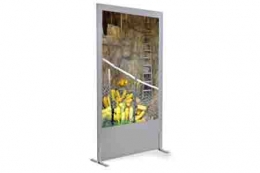 Pannello ESPOSITIVO autoportante della linea Clipper con telaio in alluminio e coprifilo plastico, lastra bifacciale in polistirene e laminato plastico cm 124x194h e n.2 piedi cm 4x45. Possibilità di posizionamento da 0 a 360 gradi.