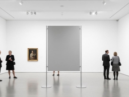 Pannello ESPOSITIVO modulare autostabile della linea Expò composto da n. 2 piantane metalliche, n. 1 lastra bifacciale sandwich punzonata (alluminio-polietilene-alluminio) cm100x150h, spessore mm 3 e n. 2 piedi metallici tondi diam. cm 39.