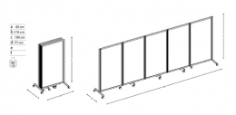 Sistema ESPOSITIVO modulare su ruote della linea Ala composto da n. 5 pannelli autoportanti da cm 100x176h con telaio in alluminio, lastra bifacciale in policarbonato alveolare e piedi metallici su ruote, cm 4x45.