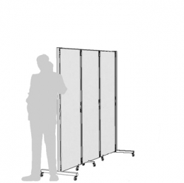Sistema ESPOSITIVO modulare su ruote della linea Clipper composto da n. 3 pannelli autoportanti con telaio in alluminio e coprifilo plastico, lastra bifacciale in bilaminato plastico, cm 65x193h, e piedi metallici su ruote, cm 4x45.