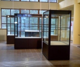 Vetrina espositiva ad ISOLA della linea Argurion a base quadrata con struttura in alluminio e lastre in vetro antinfortunio stratificato. Anta apribile con serratura ad incasso. Controllo passivo dell'umidità (silica gel granulare).
