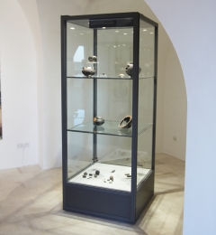 Vetrina espositiva ad ISOLA della linea Argurion a base quadrata con struttura in alluminio e lastre in vetro antinfortunio stratificato. Anta apribile con serratura ad incasso. Controllo passivo dell'umidità (silica gel granulare).
