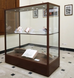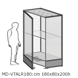Vetrina espositiva ad ISOLA della linea Argurion a base rettangolare con struttura in alluminio e lastre in vetro antinfortunio stratificato. Anta apribile con serratura ad incasso. Controllo passivo dell'umidità (silica gel granulare).