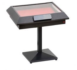 Vetrina espositiva a TAVOLO della linea Testi con struttura in metallo e gamba centrale. Piano superiore apribile con vetro stratificato antinfortunio e serratura ad incasso altezza utile teca cm 18..
