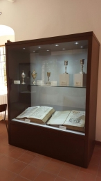 Vetrina espositiva a PARETE della linea Theca con struttura in alluminio e acciaio, pannelli di rivestimento in lamiera pressopiegata, vetro stratificato e n°2 piani interni in vetro stratificato. Controllo passivo dell’umidità (silica gel granulare). Serrature e sistema di cerniera a bilico ad incasso.