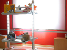 Famiglia di prodotti autoportanti realizzati in lamiera con tecnologia laser: libereie, porta riviste, lampade a stelo.