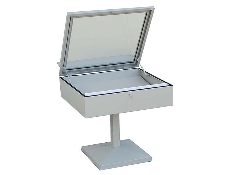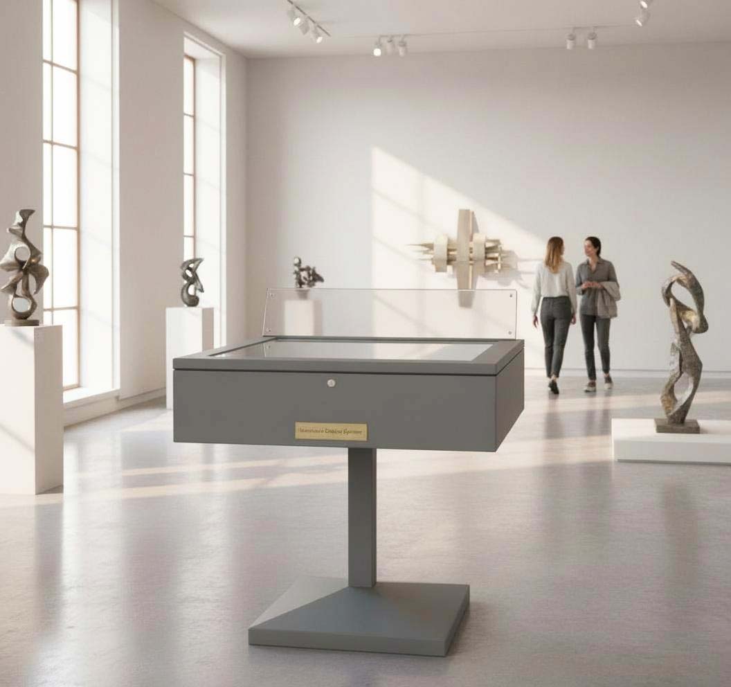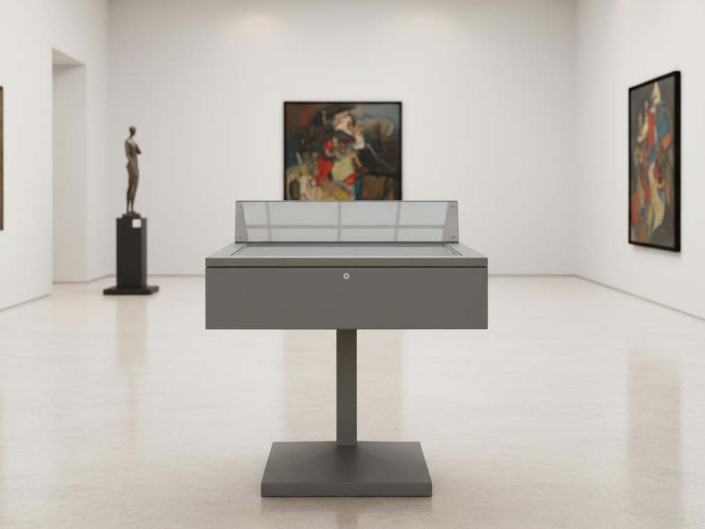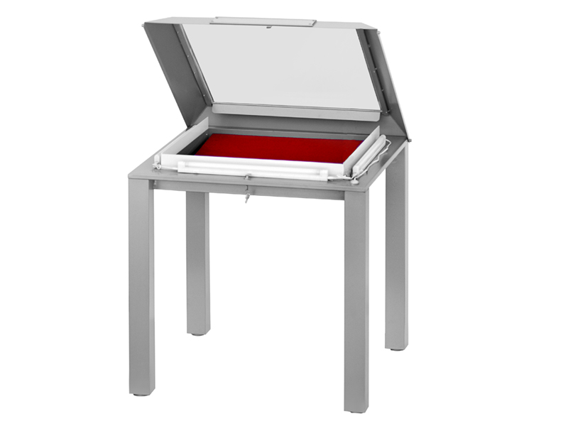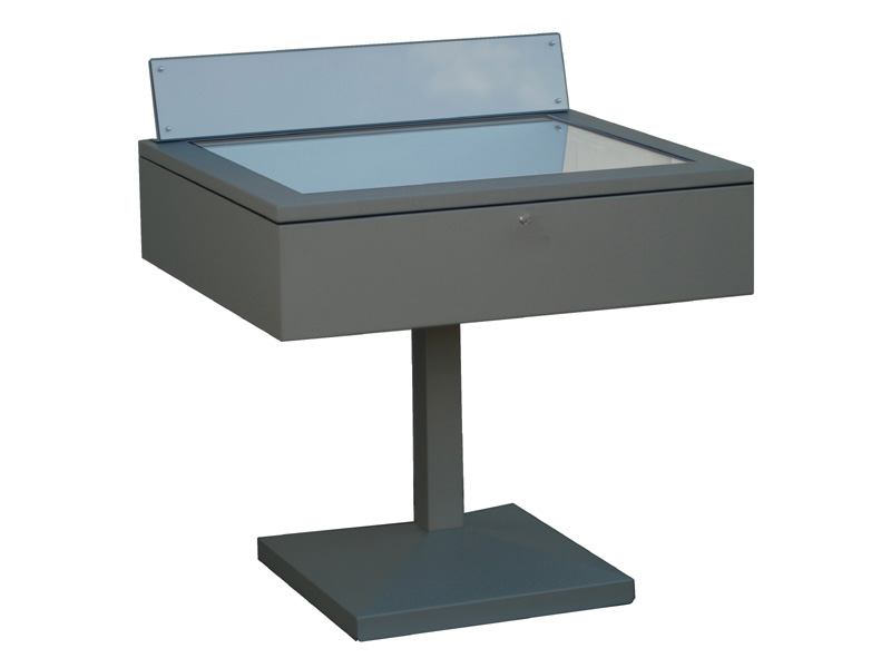 Vetrina espositiva a TAVOLO della linea Testi con struttura in metallo e n. 1 gamba centrale. Piano superiore apribile con vetro stratificato e serratura ad incasso. Vano espositivo con controllo passivo dell'umidità relativa (silica gel granulare). Finitura parti metalliche con polveri epossipoliestere a caldo, colori: grigio alluminio, grigio micaceo, corten, blu sable, bianco. Alzatina metallica porta didascalia. Dimensione vetrina cm 100x90x90h