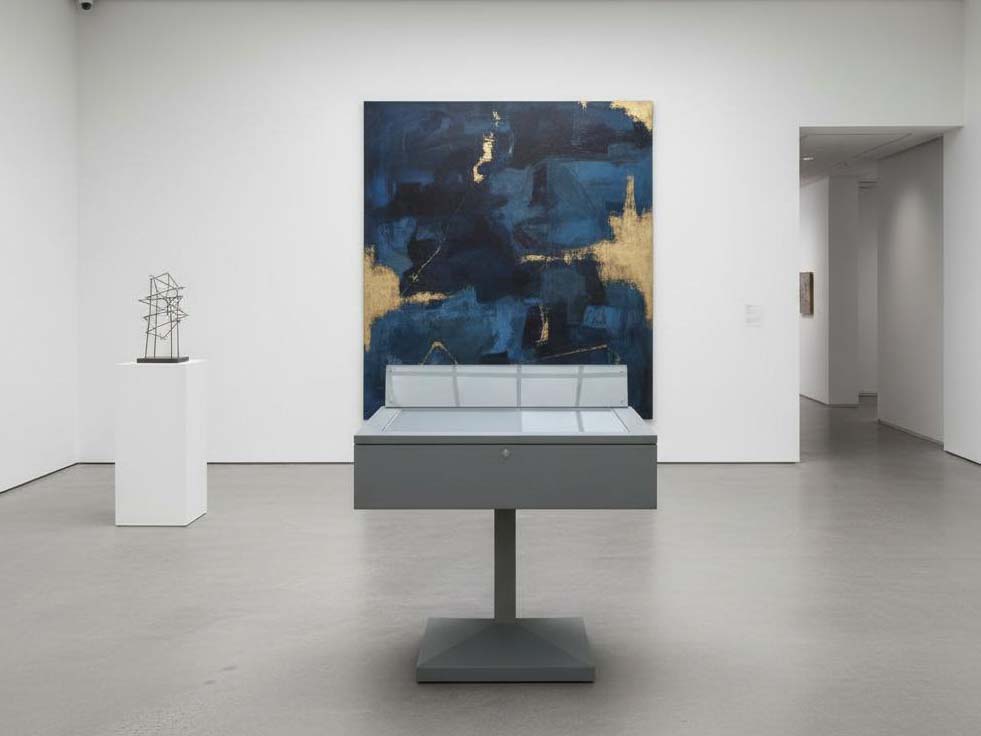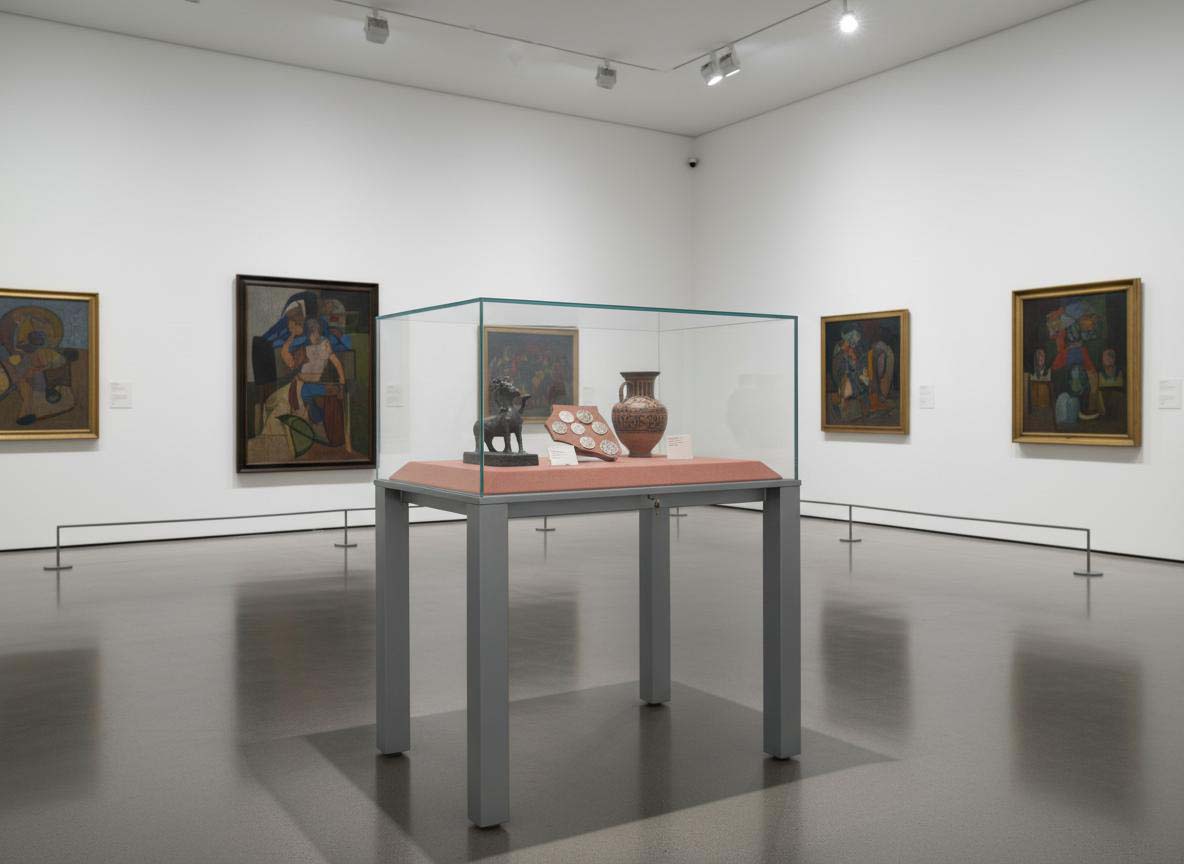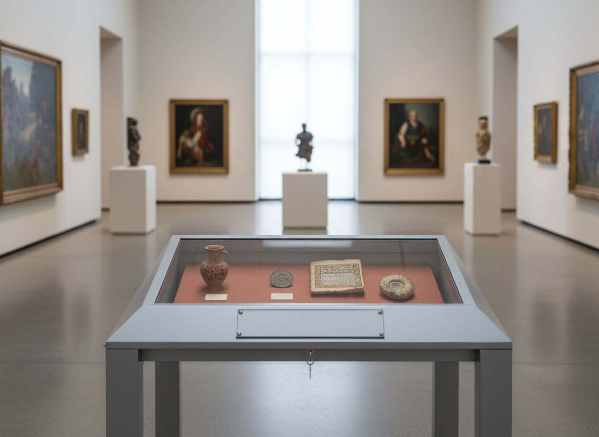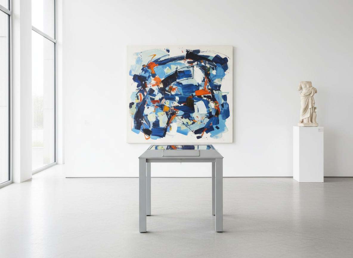 Vetrina espositiva a TAVOLO della linea Testi con struttura in metallo e n. 1 gamba centrale. Piano superiore apribile con vetro stratificato e serratura ad incasso. Vano espositivo con controllo passivo dell'umidità relativa (silica gel granulare). Finitura parti metalliche con polveri epossipoliestere a caldo, colori: grigio alluminio, grigio micaceo, corten, blu sable, bianco. Alzatina metallica porta didascalia. Dimensione vetrina cm 100x90x90h