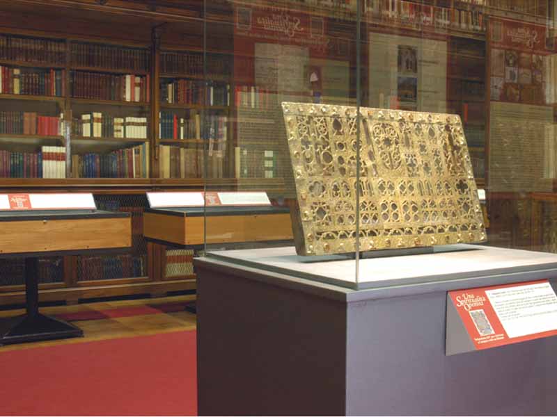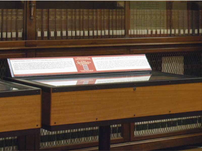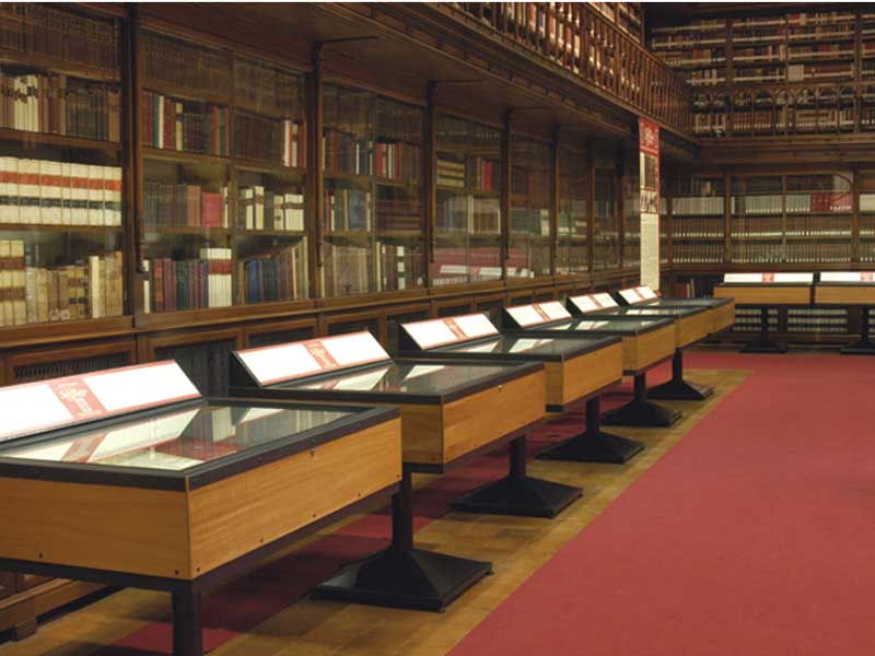 Vetrine espositive della linea testi a tavolo con struttura in acciaio e teca in vetro antinfortunio stratificato. Controllo passivo dell’umidità relativa (silica gel granulare).Le vetrine sono predisposte per impianti di illuminazione a led o fibre ottiche.
