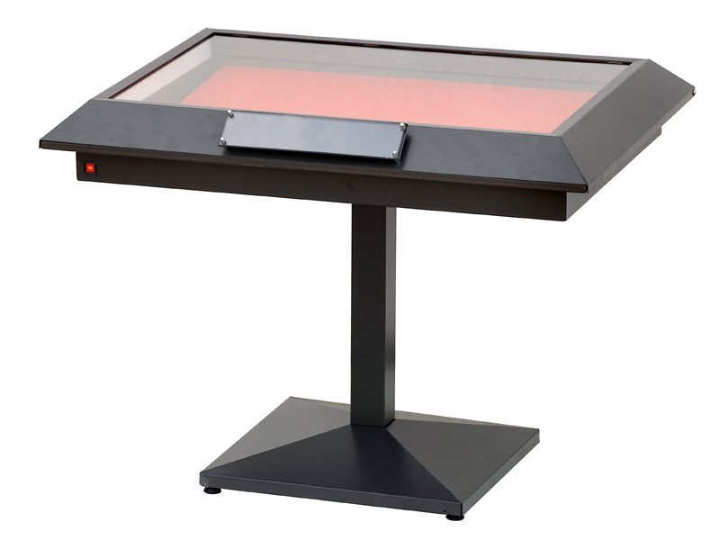 Vetrina espositiva a TAVOLO della linea Testi con struttura in metallo e n. 1 gamba centrale. Piano superiore apribile con vetro stratificato e serratura ad incasso. Vano espositivo con controllo passivo dell'umidità relativa (silica gel granulare). Kit illuminazione con n.2 lampade lineare led. Finitura parti metalliche con polveri epossipoliestere a caldo, colori: grigio alluminio, grigio micaceo, corten, blu sable, bianco. Alzatina metallica porta didascalia. Contenitore espositivo rivestito con pannelli in legno. Dimensione vetrina cm 100x90x90h.